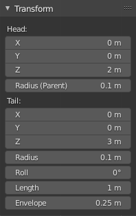 Finally, you can edit in the Transform panel in the Sidebar region the positions and radius of both joints of the active selected bone, as well as its roll rotation.