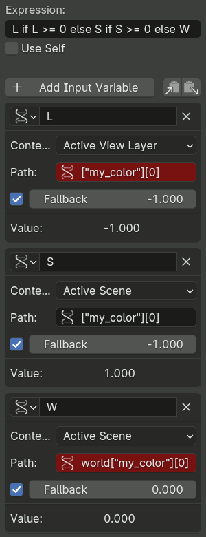["attr"]in the active View Layer (custom property).attrin the active View Layer (built-in property).["attr"]in the active Scene.attrin the active Scene.world["attr"]in the active Scene.world.attrin the active Scene.