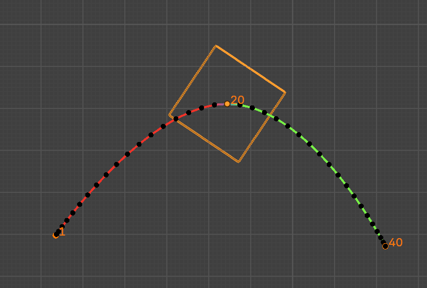 The paths are shown in red for the section in the past and green for the section in the future. These colors follow the user preference options “Before Current Frame” and “After Current Frame”, which can be found in the 3D Viewport section. Each frame is displayed by a small dot on the paths.
