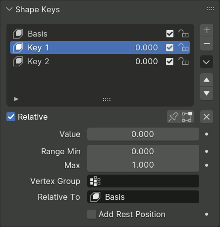 In Relative mode: Value is the current influence of the shape key used for blending between the shape (value=1.0) and its reference key (value=0.0). The reference key is usually the Basis shape. The weight of the blend can be extrapolated above 1.0 and below 0.0.