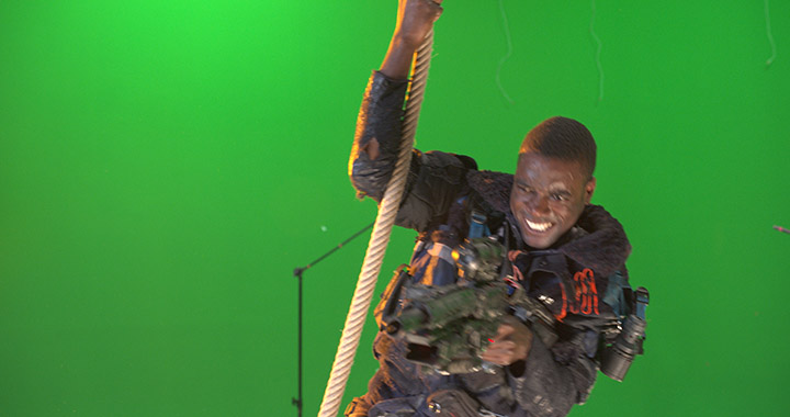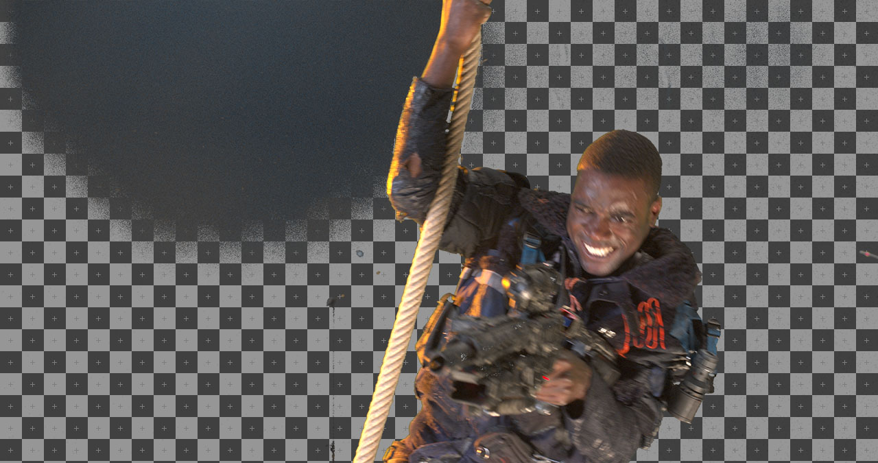 Example of a poor mask: Some of the backdrop is opaque, and some parts of the gun in the foreground are transparent.¶