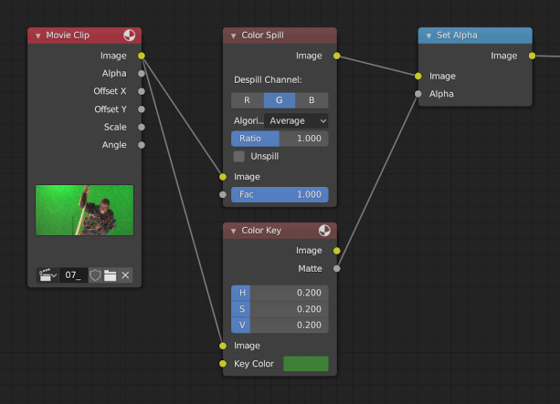 The Keying Screen node creates plates for use as a color reference for keying nodes. It generates gradients from sampled colors on motion tracking points on movie clips. It can be used to deal with uneven colors of green screens.