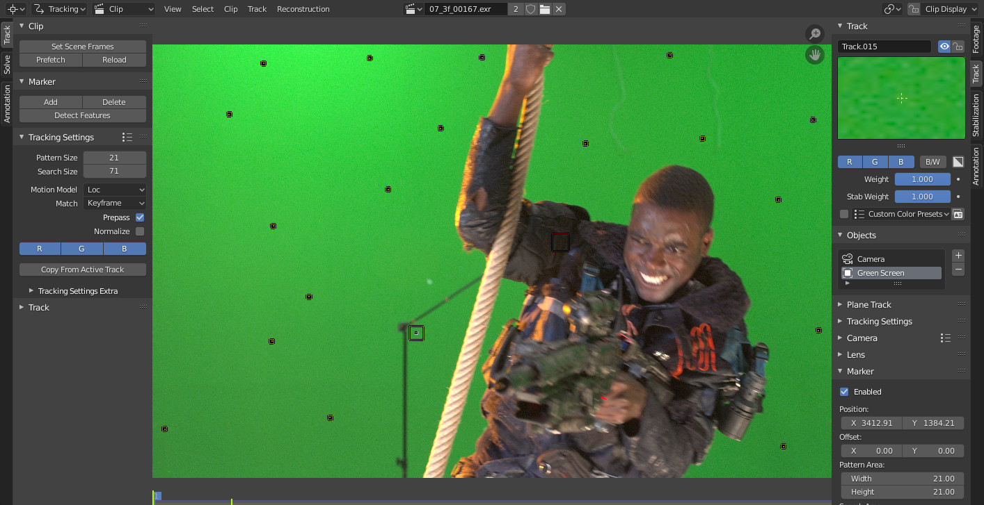 These tracks may be tracked or moved manually, so gradients can be updated over time. If the marker is not enabled for a frame, it will not be used creating the gradient. (Such as the red-colored marker on the arm in the screenshot above)