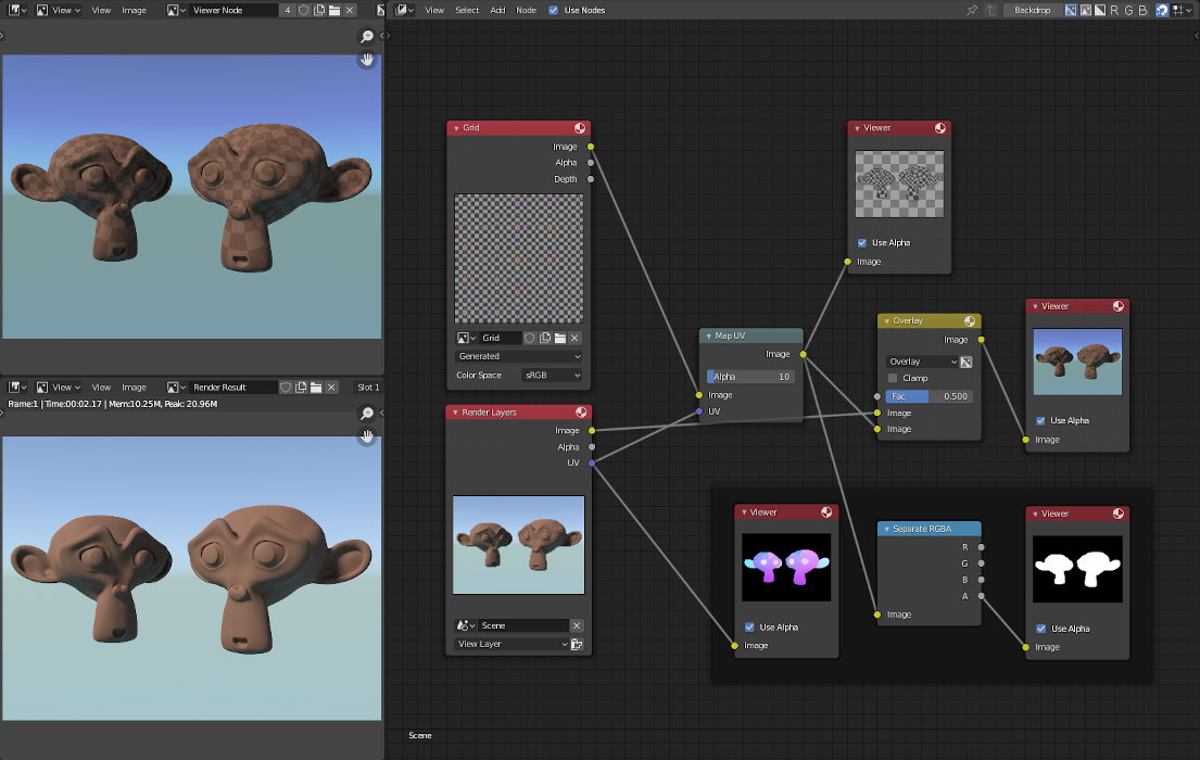 In the example below, we have overlaid a grid pattern on top of the two heads after they have been rendered. During rendering, we enabled the UV layer in the Properties . Using a Mix node (“Overlay” in figure), we mix that new UV texture over the original face. We can use this grid texture to help in any motion tracking that we need to do.