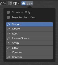 Rather than using a radius only, the proportional falloff spreads via connected geometry. This means that you can proportionally edit the vertices in a finger of a hand without affecting the other fingers. While the other vertices are physically close (in 3D space), they are far away following the topological edge connections of the mesh. The icon will have a blue center when Connected is active. This mode is only available in Edit Mode.