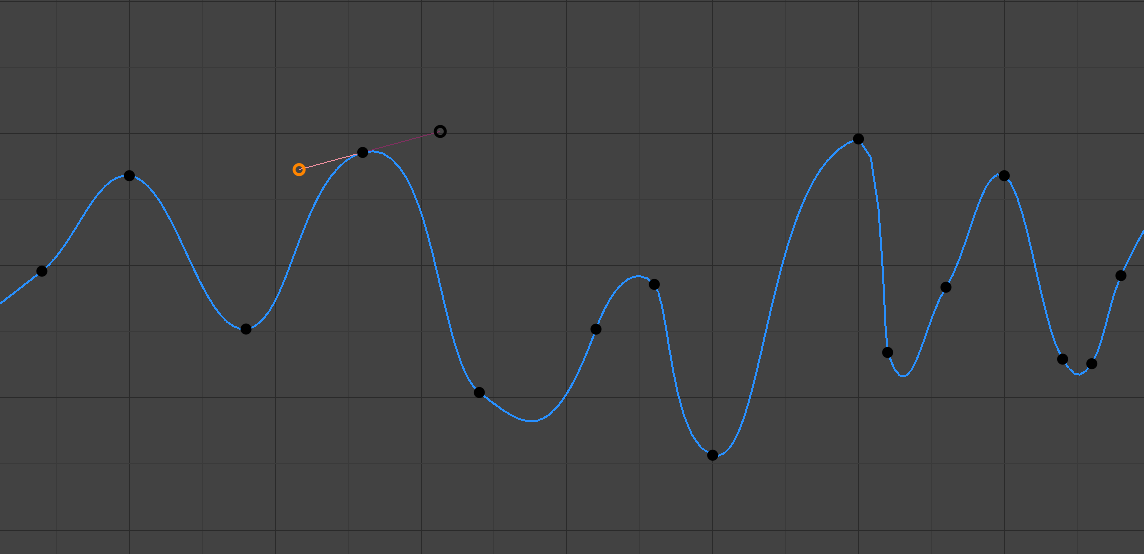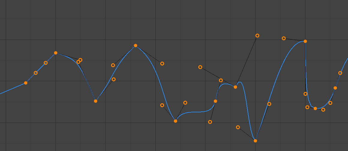 When the keyframe’s interpolation is set to Bézier, the shape of the curve around it is influenced by its handles. Each handle has its own type which determines if (and how) Blender positions it automatically, and if not, how much freedom you have in positioning it manually.