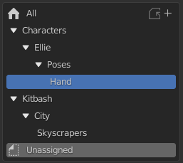 Examples are Characters/Ellie/Poses/Hand or Kitbash/City/Skyscrapers,