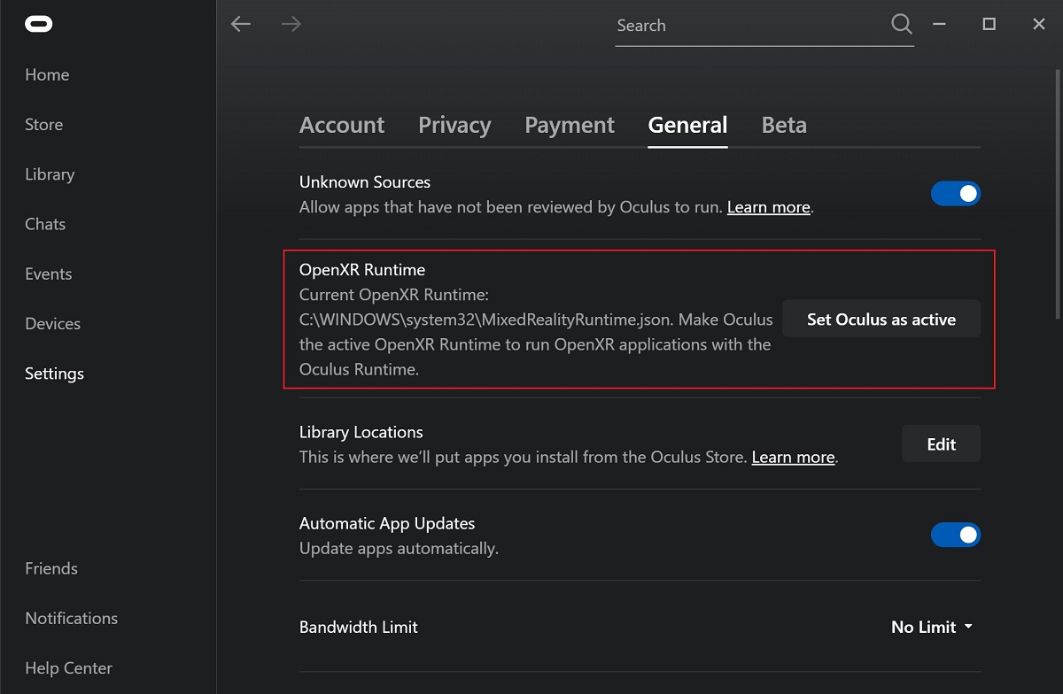 Set Oculus as the active OpenXR runtime via the General tab in the Oculus App Settings.