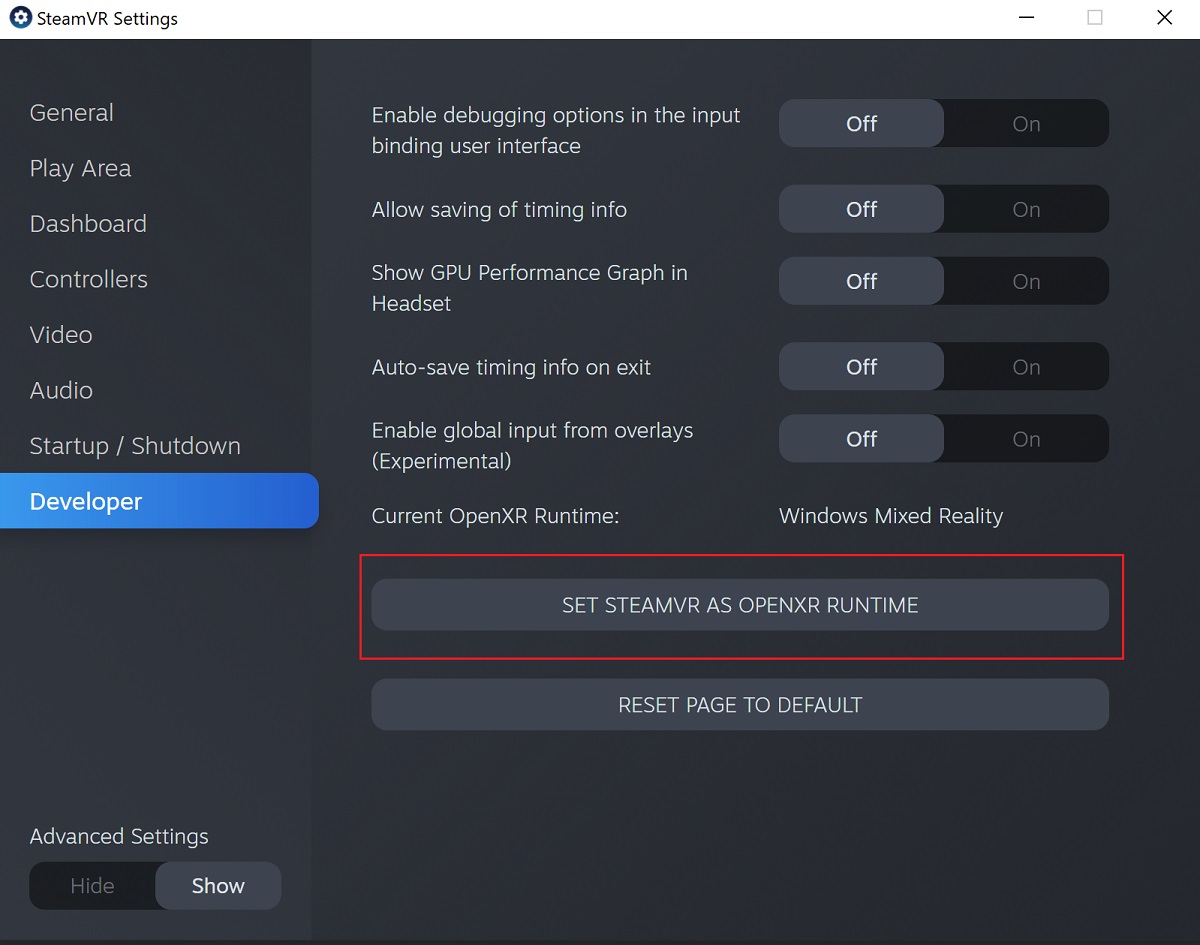 Set SteamVR as the active OpenXR runtime via the Developer tab in the SteamVR Settings.