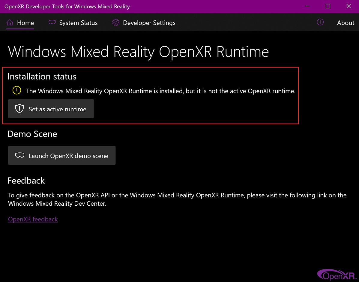 To switch to Windows Mixed Reality from another OpenXR runtime (e.g. SteamVR), download the OpenXR Developer Tools from the Microsoft Store and set Windows Mixed Reality as the active runtime.