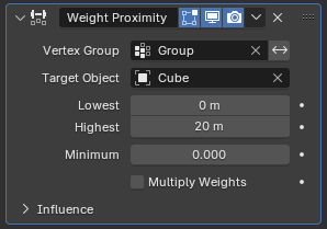 This modifier sets the weights of the given vertex group, based on the distance between the object (or its vertices), and another target object (or its geometry).