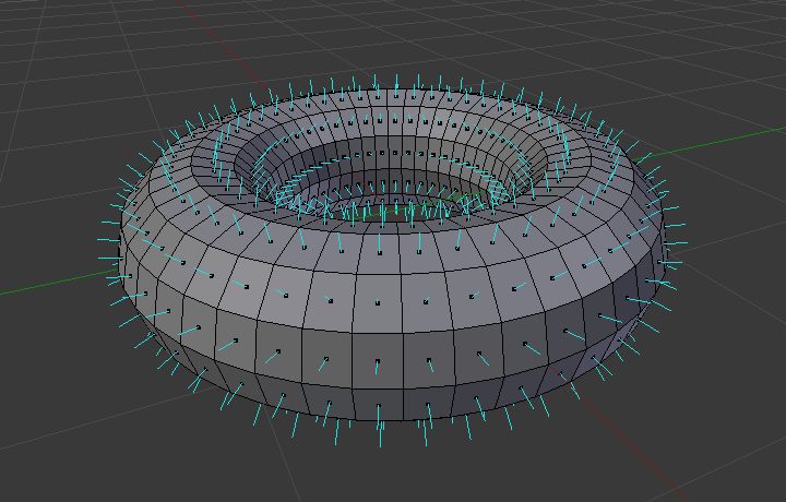 In the figure above, each blue line represents the normal for a face on the torus. The lines are each perpendicular to the face on which they lie. The visualization can be activated, in Edit Mode, in the Mesh Display Viewport Overlays panel.