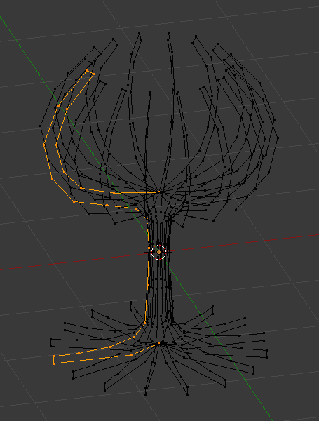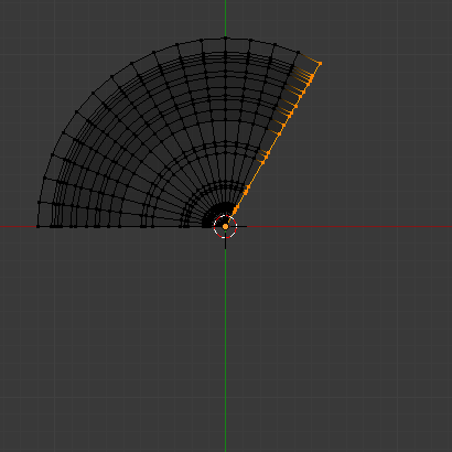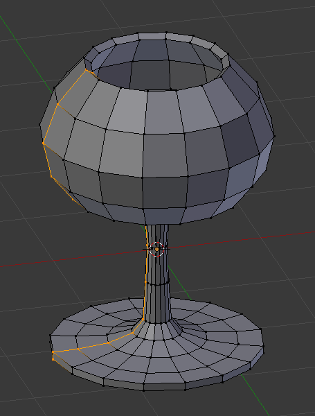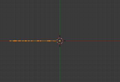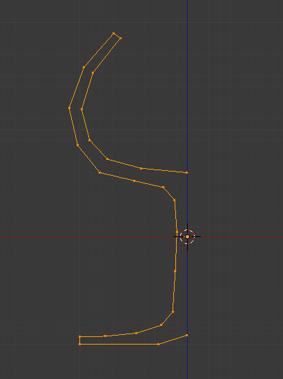 Place the cursor along the center of the profile by entering Edit Mode and selecting one of the vertices along the center, and snapping the 3D cursor to that location with . (Fig. Glass profile, top view in Edit Mode, just before spinning.) shows the wine glass profile from top view, with the cursor correctly positioned.