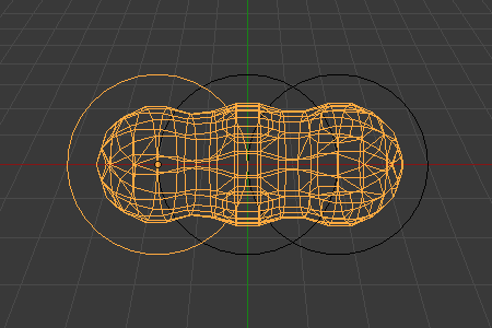 Fig. Meta ball base. shows the base meta labeled “B”. The other two Meta objects are children. Children’s selection rings are always black, while the group’s mesh is orange. Because the metas are grouped, they form a unified mesh which can always be selected by selecting the mesh of any meta in the group.