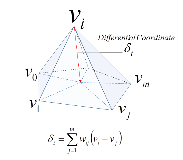 Laplacian Surface Editing is a method developed by Olga Sorkine and others in 2004. This method preserves geometric details as much as possible while the user makes editing operations. This method uses differential coordinates corresponding to the difference between a vector and the weighted average of its neighbors to represent the local geometric detail of the mesh.