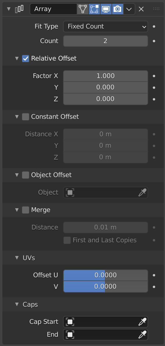 The transformation applied from one copy to the next is calculated as the sum of the three different components (Relative, Constant and Object), each of which can be enabled/disabled independently of the others. This allows, for example, a relative offset of (1.0, 0.0, 0.0) and a constant offset of (0.1, 0.0, 0.0), giving an array of objects neatly spaced along the X axis with a constant 0.1 unit between them, whatever the original object’s size.