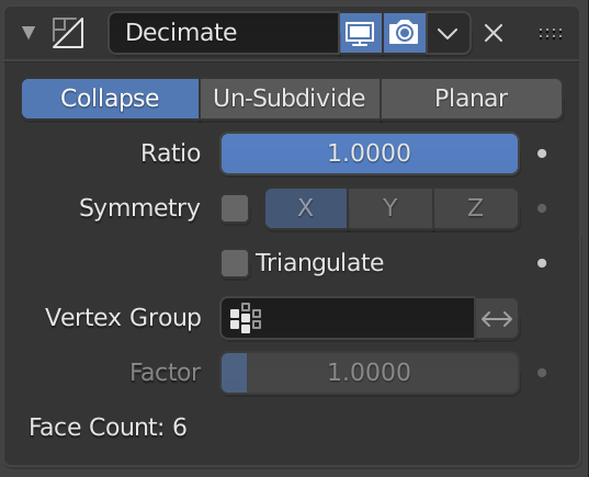 The modifier displays the number of remaining faces as a result of the Decimate modifier.