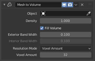 The Mesh to Volume modifier uses a mesh to create a new volume grid. All previously existing volume grids on the volume object are discarded. So this modifier is usually added to an empty volume object. The new volume grid is called “density”.
