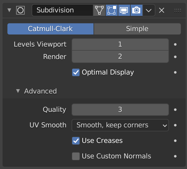 The Subdivision Surface modifier (often shorten to “Subdiv”) is used to split the faces of a mesh into smaller faces, giving it a smooth appearance. It enables you to create complex smooth surfaces while modeling simple, low-vertex meshes. It avoids the need to save and maintain huge amounts of data, and gives a smooth “organic” look to the object.