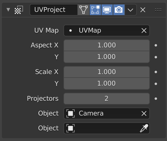 Up to ten projector objects are supported. Each face will choose the closest and aligned projector with its surface normal. Projections emit from the negative Z axis (i.e. straight down a camera or light). If the projector is a camera, the projection will adhere to its perspective/orthographic setting.