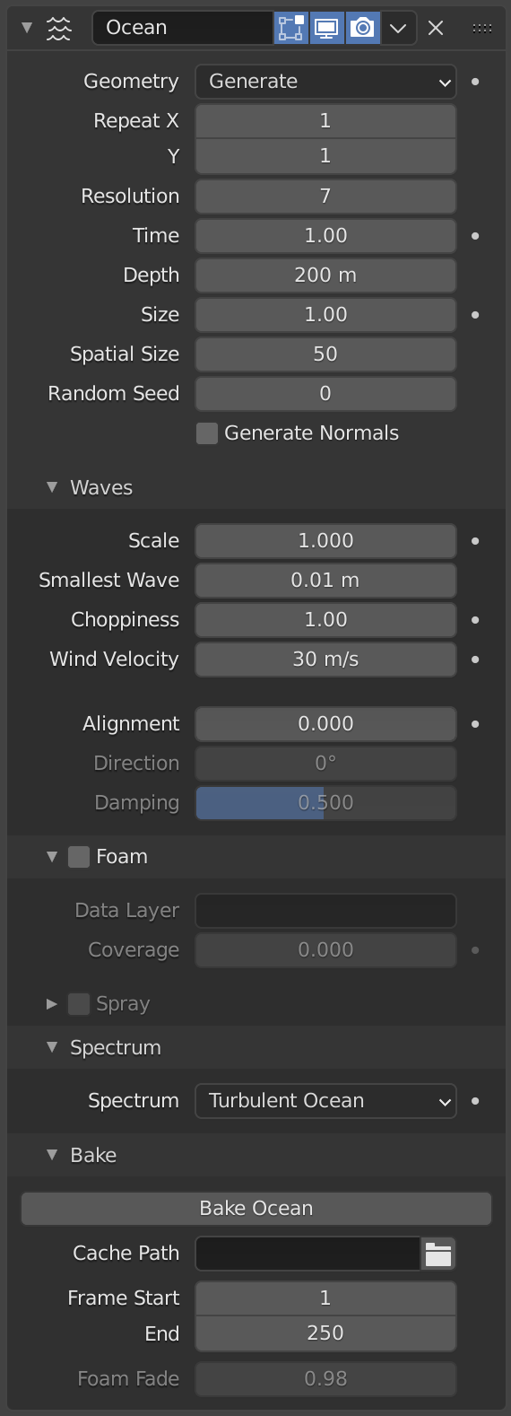 Baking also provides improved foam capabilities. When simulating live, the ocean simulator retrieves data for that current frame only. In the case of the foam map, this represents the tips of wave crests for that given frame. In reality, after foam is created by wave interactions, it remains sitting on the top of the wave surface for a while, as it dissipates. With baking, it is possible to approximate that behavior, by accumulating foam from previous frames, leaving it remaining on the surface.