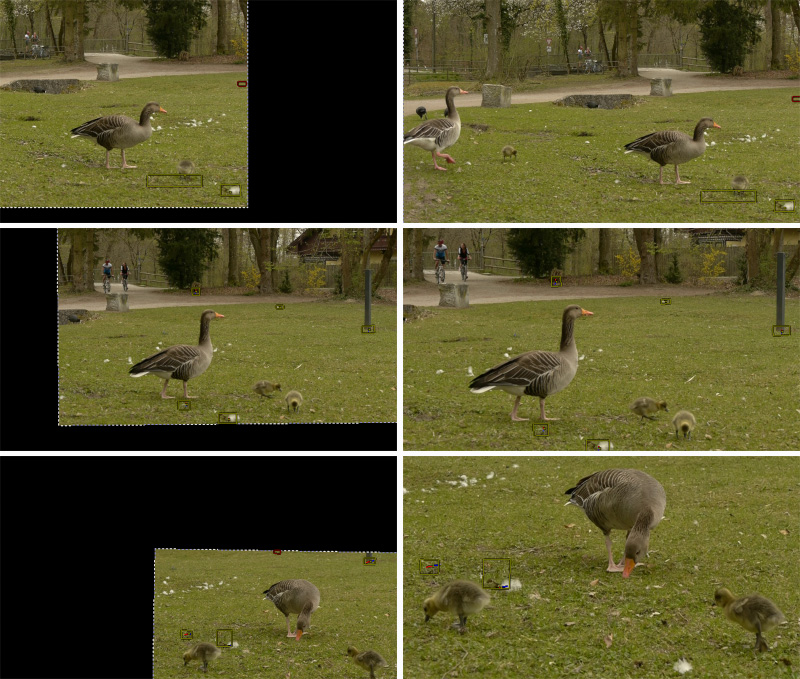 But when the camera was moved intentionally, we have to consider yet another frame of reference beyond the canvas: namely the frame (or “cadre”) of the final image we want to create. To understand this distinction, let’s consider a hand-held, panning shot to the right: Since our camera was turned towards the right side, the actual image contents move towards the left side within the original image frame. But let’s assume the stabilizer was successful with “fixing” any image contents relative to the canvas – which in turn means, that the original image boundaries start to move irregularly towards the right side, and the contents of the image will begin to disappear gradually behind the left boundary of the original image. After some amount of panning, we’ll have lost all of our original contents and just see an empty black image backdrop. The only solution to deal with that problem is to move the final image frame along to the right, thus following the originally intended panning movement. Of course, this time, we do want to perform this newly added panning movement in a smooth and clean way.