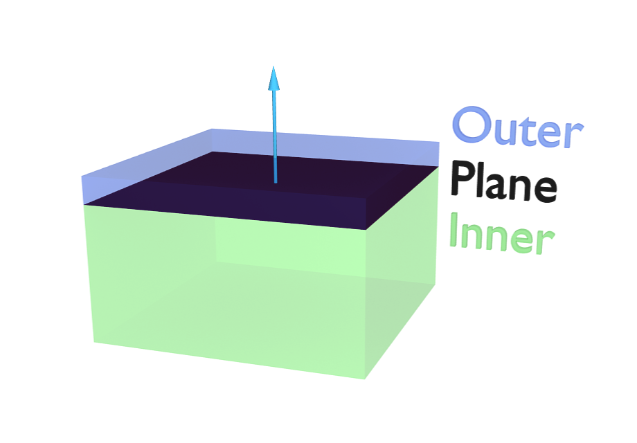 A padding distance is added to the inside and outside of each face, to help to prevent intersections. The soft body will come to rest at this distance away from the face of the colliding object. Outside and inside is defined by the face normal, depicted as blue arrow in Fig. A soft body vertex colliding with a plane..