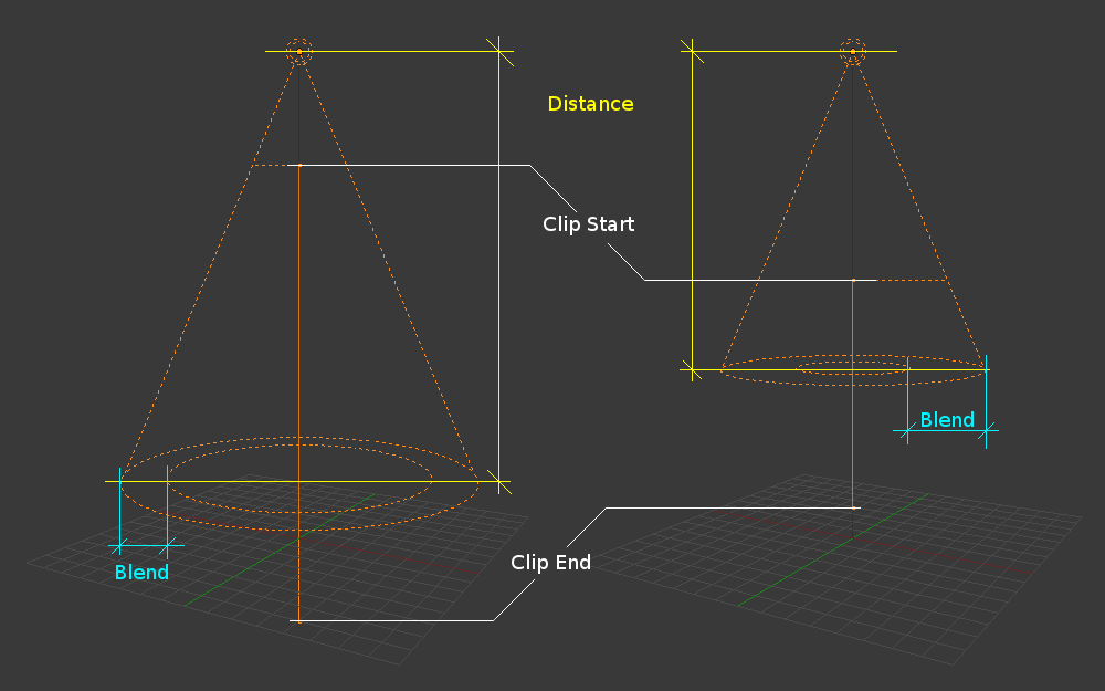The inner cone boundary line indicates the point at which light from the spot will start to blur/soften; before this point its light will mostly be full strength. The larger the value of Blend the more blurred/soft the edges of the spotlight will be, and the smaller the inner cone’s circular area will be (as it starts to blur/soften earlier).