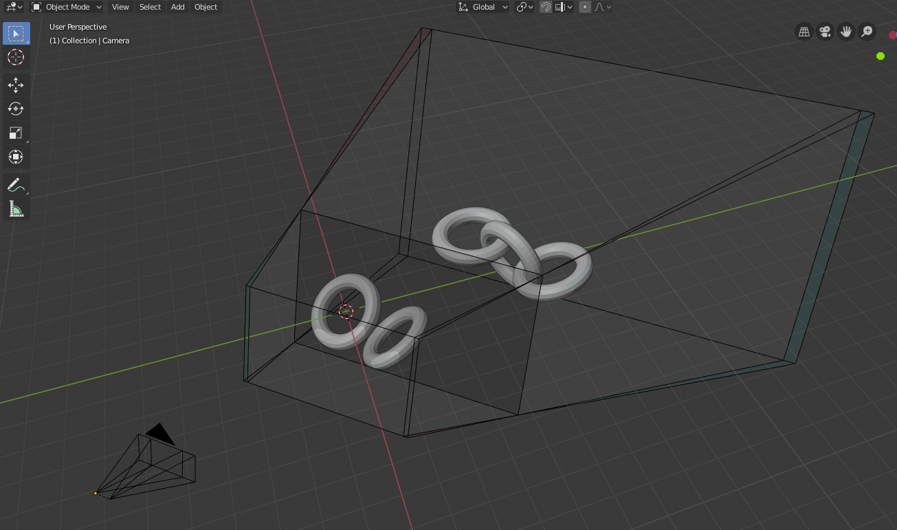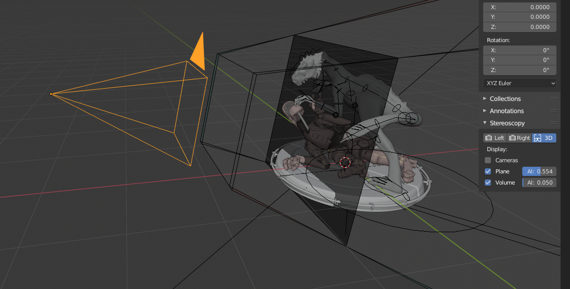 You can toggle this and other display settings in the Stereoscopy panel of the 3D Viewport’s Sidebar. In the following image, the camera’s frustum volumes are also visible.